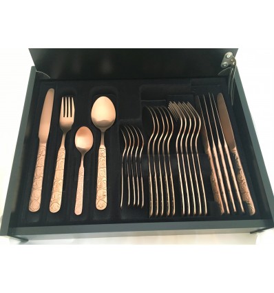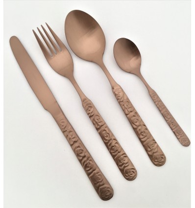 HERDMAR Комплект прибори за хранене “ROSAS“ - за 6 човека от 24 части - с PVD покритие шоколад/мат • Изработени от неръждаема стомана 18/10• PVD покритие. Комплектът включва:• Нож за хранене: 6 бр. • Вилица за хранене: 6 бр. • Лъжица за хранене: 6 бр.• Лъжичка за чай: 6 бр.Производител: HERDMAR / Португалия