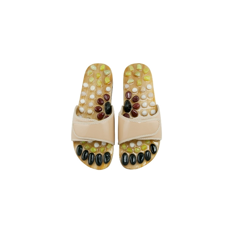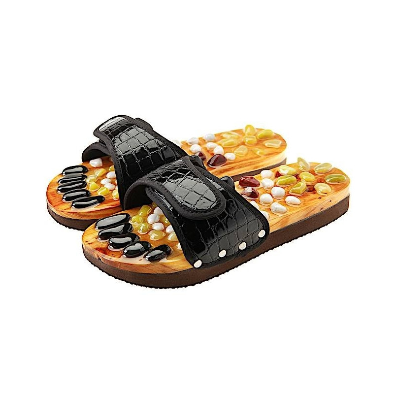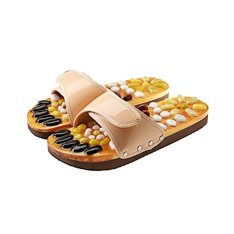 Терапията с естествени камъни е мощно средство за релаксация, възстановяване на емоционалния баланс, облекчаване на мускулното напрежение. Масажиращите чехли на CASADA са изработени от 100% естествени материали. С помощта на органични смоли, върху дървена подметка са поставени общо 54 естествени камъка от нефрит, яспис и магнетит.
