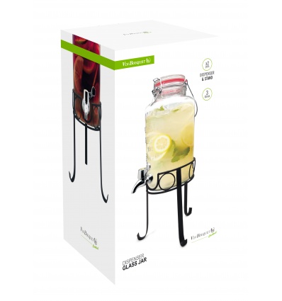 Чашата Ви никога не ще остане празна с този огромен диспенсър за напитки! Вдъхновен от традициите на домашно приготвените напитки, дизайнът на този диспенсър пресъздава огромен буркан. Изработен от дебело, висококачествено стъкло, с капак, който се затваря плътно с клипс. Широко гърло, за лесно добавяне на лед, плодове, листа мента и всички други добавки към питието Ви. Наливането става бързо и лесно посредством симпатично кранче, разположено в долната част на диспенсъра.