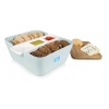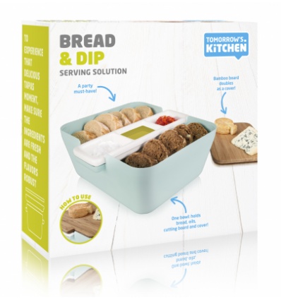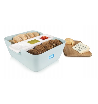 Кутия за хляб, купички за разядки и дъска за рязане • Цвят: светло синьо• Подходящ за хляб и сладкиши• Бамбукова дъска за рязане, която се използва и като капак• Размер: 24,8 x 24,5 x 10,7 cm• Тегло:1,20 kg • Материал: бамбук, пластмаса, керамика• Подходящи за измиване в съдомиялна машина са пластмасовата и керамичната купаПроизводител: TOMORROW`S KITCHEN / Холандия