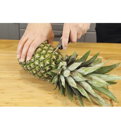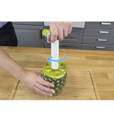 Резачка за ананаси обелва, изважда и нарязва ананас само за 30 секунди. Тя работи като тирбушон, като изважда плода в перфектно оформени пръстени. С отделна резачка можете да нарежете извадения ананас с едно просто движение на еднакви парченца. Резачката може да се използва от двете страни, а удобните дръжки осигуряват контролирано движение на рязане на ананасовите пръстени. Новият захват осигурява здраво задържане и може да бъде освободен с едно натискане на бутона. Ананасовата обвивка остава непокътната, за да я използвате за сервирането на десерта  или плодовата салата.