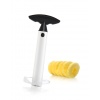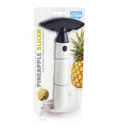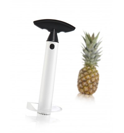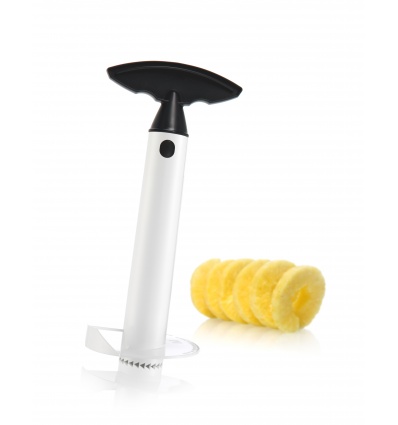 Резачка за ананаси обелва, изважда и нарязва ананас само за 30 секунди. Тя работи като тирбушон, като изважда плода в перфектно оформени пръстени. Удобната дръжка осигурява контролирано движение за рязане на ананасовите пръстени - едно кръгче, по-голямо парче или целия ананас на веднъж. Новият захват осигурява здраво задържане и може да бъде освободен с едно натискане на бутона. Ананасовата обвивка остава непокътната, за да я използвате за сервирането на десерта, плодовата салата или плодов коктейл. Пресни, сочни, вкусни - идеални ананасови парчета за по-малко време, отколкото е нужно да отворите консерва!
