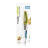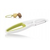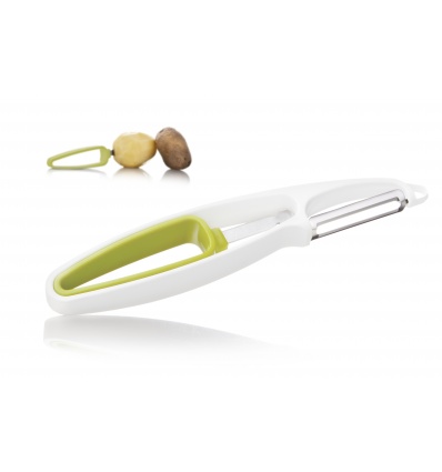 Белачка с държач е комбинация от прибори, която Ви гарантира безопасно почистване и обелване на всички твърди плодове и зеленчуци. Държача се поставя в плода (зеленчука), който трябва да бъде обелен. След това кората лесно може да бъде отстранена с белачката. Белачката има остър връх за отстраняване и изрязване на развалени петна, например от карофи. Като използвате държача, вместо да държите плода с ръка, беленето става много по-бързо и безопасно. Държача се прибира в дръжката на белачката, за лесно съхранение.