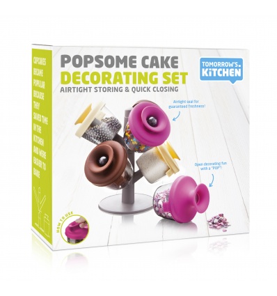 Комплектът за декорация на сладкиши е практичен начин за съхраняване и разпределяне на всички видове украса. Цветните капаци и патентованата система Oxiloc са специално разработени, за да гарантират, че купите остават херметически затворени. Вашите любими декорации за сладкиши могат удобно да се съхраняват готови за употреба. Когато капакът е "отворен" можете да разпределите съдържанието в ръката си или директно над сладкиша. Комплектът се предлага с удобна, специално разработена стойка, която дава възможност за поставяне на до 9 диспенсера.