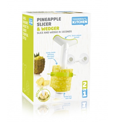 Резачка за ананаси обелва, изважда и нарязва ананас само за 30 секунди. Тя работи като тирбушон, като изважда плода в перфектно оформени пръстени. С отделна резачка можете да нарежете извадения ананас с едно просто движение на еднакви парченца. Резачката може да се използва от двете страни, а удобните дръжки осигуряват контролирано движение на рязане на ананасовите пръстени. Новият захват осигурява здраво задържане и може да бъде освободен с едно натискане на бутона. Ананасовата обвивка остава непокътната, за да я използвате за сервирането на десерта  или плодовата салата.