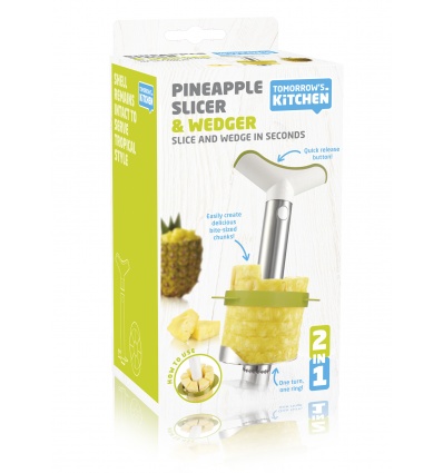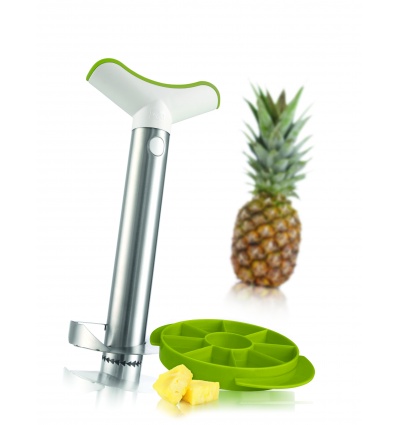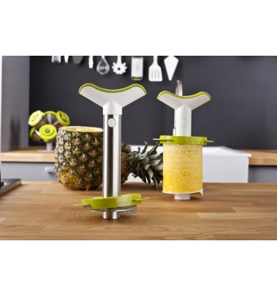 Стоманената резачка за ананаси обелва, изважда и нарязва ананас само за 30 секунди. Тя работи като тирбушон, като изважда плода в перфектно оформени пръстени. С отделна резачка можете да нарежете извадения ананас с едно просто движение на еднакви парченца. Резачката може да се използва от двете страни, а удобните дръжки осигуряват контролирано движение на рязане на ананасовите пръстени. Новият захват осигурява здраво задържане и може да бъде освободен с едно натискане на бутона. Ананасовата обвивка остава непокътната, за да я използвате за сервирането на десерта  или плодовата салата.