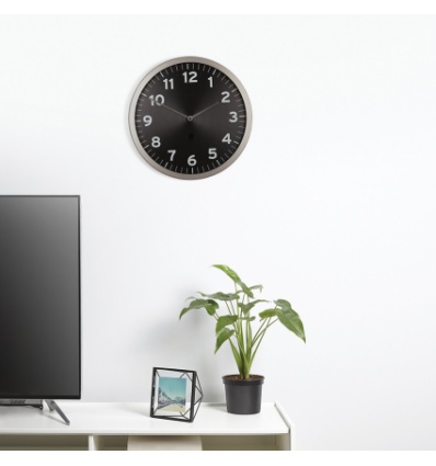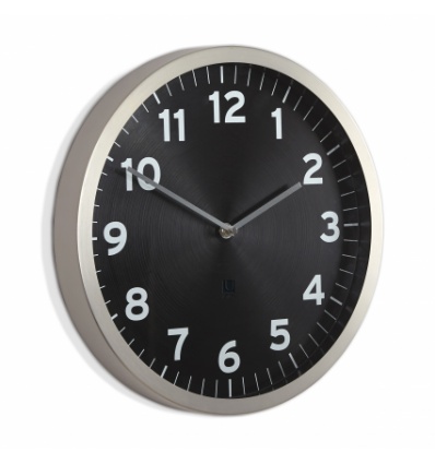 UMBRA Часовник за стена “ANYTIME“ • Цвят: черен циферблат / иноксова рамка • Размери: Ø 31,8 см x 3,9 cm • Материал: метал, стъкло • Безшумен механизъм • Захранване: 1 бр батерия АА ( не са включени) Производител: UMBRA / Канада DESIGN: UMBRA STUDIO