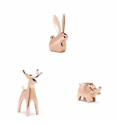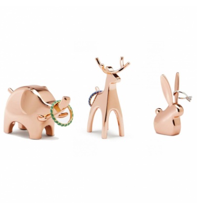 UMBRA К-т от 3бр. поставки за пръстени "ANIGRAM" • Цвят: Мед• Размери: 4,5 х 4,5 х 7,6 см• Материал: Метал• Комплектът включва: зайче, слон и еленПроизводител: UMBRA / КанадаDesign: Sung wook Park