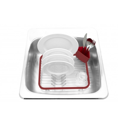 UMBRA Сушилник за съдове “SINKIN “ ; • Цвят: никел / червен• Размер: 35,6 x 27,9 х 13,3 cm• Отделение за прибори • Материал: металПроизводител: UMBRA / Канада DESIGN: HELEN T. MILLER