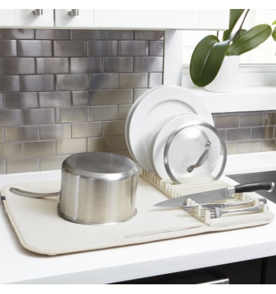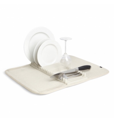 UMBRA Сушилник за съдове “UDRY “ ; • Цвят: крем• Размер: 61 x 45,7 cm• Лесен за сгъване и съхранение • Материал: – стойка за чинии:  полипропилен ( BPA free )– основа:  бързо съхнеща материя• Пране на основата• Стойката е подходяща за измиване в съдомиялна машина Производител: UMBRA / Канада DESIGN: DAVID GREEN