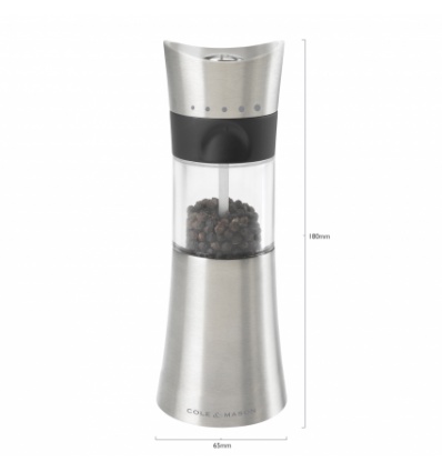 COLE & MASON Мелничка за пипер “WESTBURY“• Височина: 18 см.• Материал: акрил, стомана• Цвят: инокс• Механизъм: закалена въглеродна стомана• Регулируеми настройки на мелене: 5 - степенен механизъм• Пълна (с черен пипер)• Да не се мокри с вода!• Не използвайте мелничката за различни от черен пипер продукти!!! Производител: Cole&Mason / Англия