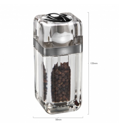 COLE & MASON Мелничка за пипер + солница “KEMPTON“• Височина: 13 см.• Материал: акрил, стомана• Цвят: прозрачен• Механизъм: закалена въглеродна стомана• Регулируеми настройки на мелене: от едро до фино• Пълна (с черен пипер)• Да не се мокри с вода!• Не използвайте мелничката за различни от черен пипер продукти!!! Производител: Cole&Mason / Англия