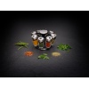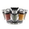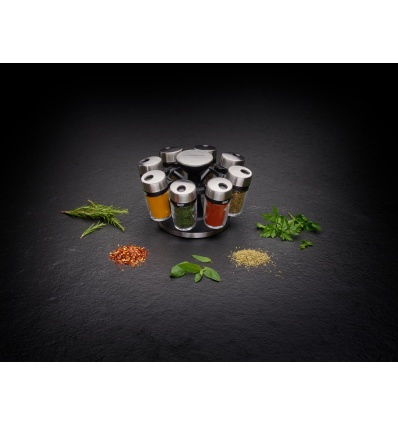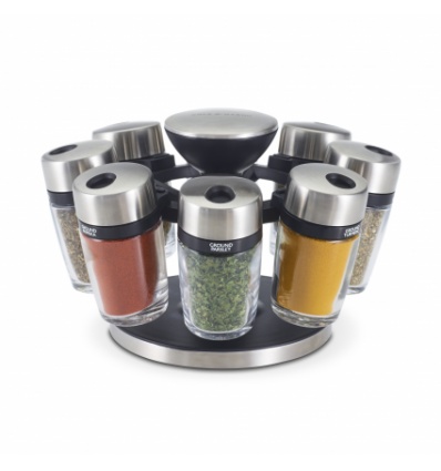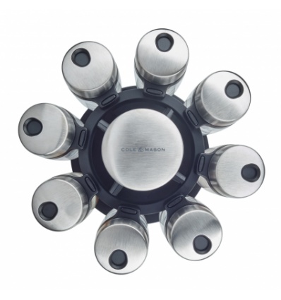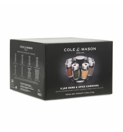 COLE & MASON Комплект за подправки “HERB & SPICE“ - 8 части + стойка • 8 бр. стъклени бурканчета с подправки, с възможност за презареждане • Височина на бурканчето: 85 мм• Хромирани капачки, които се затварят херметически и са с два вида отвори за правилно дозиране • Въртяща се стойка с удобна дръжка за носене; • Материали: стъкло, пластмаса, метал• Размери на стойката: 14 х 22,5 см.( Д х В)• Подправки: мащерка, босилек, риган, магданоз, розмарин, куркума, градински чай, червен пиперПроизводител: Cole&Mason / Англия