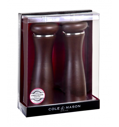 Класическият дизайн на мелничките от тъмно дърво добавя изтънченост към всяка маса, като същевременно остава ежедневен кухненски аксесоар. Регулирайте степента на меленето от фино до едро чрез затягане или разхлабване на топчето на капака. Мелничките Sherwood Forest разполагат с механизъм от закалена въглеродна стомана (за мелничките за пипер) и усъвършенстван керамичен механизъм (за мелничките за сол). Механизмът Cole & Mason Precision не смачква зърната черен пипер, а ги стрива, за да освободи максималното количество аромати при всяко завъртане.