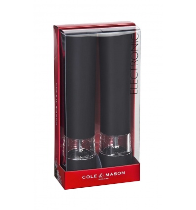COLE & MASON Луксозен комплект електрически мелнички за сол и пипер “VICTORIA“• Комплектът включва мелничка за сол и пипер• Височина на мелничките: 210 мм• Необходими са 6 бр батерии (тип ААА) за всяка мелничка• Батерии НЕ са включени в комплекта• Специално "Soft Touch" покритие• Керамичен механизъм• Регулируеми настройки на мелене: от грубо до фино• Материал: акрил• Прозрачен прозорец • Цвят: черен• Никога не поставяйте мелничките в директен контакт с вода или под течаща вода.• Не използвайте мелничките за смилане на различни от черен пипер и каменна сол продукти!!!Производител: Cole&Mason / Англия