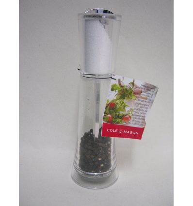 COLE & MASON Мелничка за пипер + солница “EVERYDAY“• Височина: 16.5 см.• Материал: акрил, стомана• Цвят: прозрачен• Механизъм: закалена въглеродна стомана• Регулируеми настройки на мелене: от едро до фино• Пълна (с черен пипер)• Да не се мокри с вода!• Не използвайте мелничката за различни от черен пипер продукти!!! Производител: Cole&Mason / Англия