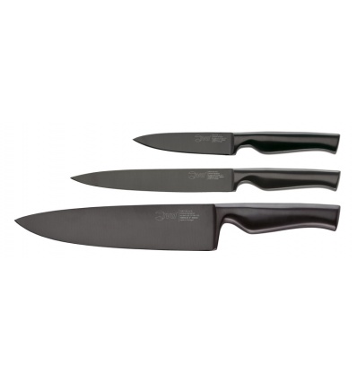 • Нож на майстора - дължина на острието 20 см.• Универсален нож - дължина на острието 16 см• Нож за белене - дължина на острието 10 см.• Ножовете са изработени от неръждаема стомана X50 Cr Mo V15• Титаниево покритие на острието - предпазва от контакт с киселини от храната и запазва острието за по-дълго време • Ергономична дръжка, изработена от  полипропиленПроизводител: IVO Cutelarias / Португалия