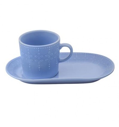 Комплект от серията Цвете на късмета, включващ керамична чаша за кафе с продълговата чинийка за десерт. Подходящи за почистване в миялна машина. Вместимост 220 мл.