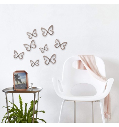 UMBRA Комплект декорация за стена “FLITTERBYE““ • Цвят: бронз• Сет от 8 бр пеперуди• Закрепване за стена (с включени двойнолепящи лепенки)• Четири размера в комплект: от (8,9 x 7) до (14 х 10) cm• Материал: пластмасаПроизводител: UMBRA / КанадаDESIGN:  MARION LANKTREE & UMBRA STUDIO