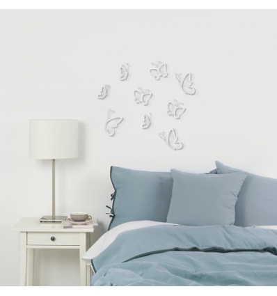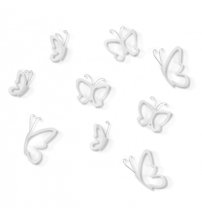 UMBRA Декорация за стена “MONARCHY“ • Цвят: бял, хром• Сет от 9 бр пеперуди с метален елемент• Три профила• Закрепване за стена (с включени двойнолепящи лепенки)• Три размера в комплект: от (7,6 x 12,7 ) до (15,2 х 15,2) cm• Материал: пластмаса, металПроизводител: UMBRA / КанадаDESIGN: DENNIS CHENG & MARION LANKTREE
