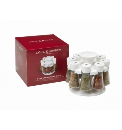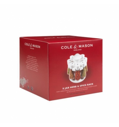 COLE & MASON Комплект за подправки “HUDSON“ - 8 части + стойка • 8 бр. стъклени бурканчета с подправки, с възможност за презареждане • Вместимост на бурканчетата: 70 мл • Височина на бурканчето: 105 мм• Капачките се затварят херметически и са с два вида отвори за правилно дозиране • Стойка с удобна дръжка за носене; • Материали: стъкло, пластмаса• Размери на стойката: Ø 19 х 17 см.(h)• Подправки: мащерка , босилек, резене (див копър) , кориандър, майорана, риган, магданоз,чили (натрошено)Производител: Cole&Mason / Англия