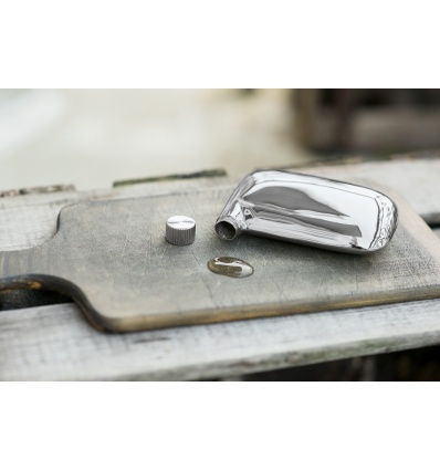 Уникалният дизайн, без никакви ъгли или ръбове, гали очите. В студените дни, неговото съдържание може  да затопли настроението Ви . Блестящият полиран контейнер от неръждаема стомана предлага достатъчно място за 150 мл силни спиртни напитки. Той се вписва удобно в джоба на сакото или панталоните, без да се пречи.
