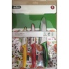 ZYLISS Комплект от 3 бр. ножове с дъска за рязане • Универсален нож: 13см - зелена дръжка • Нож с назъбено острие: 10 см - червена дръжка • Нож за белене: 7см - жълта дръжка• Защитни калъфи за съхранение • Пластмасова дъска зелена: 35 х 25 см Производител: Zyliss / Швейцария