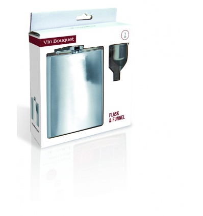 Vin Bouquet Комплект бутилка за алкохол и фуния• Размери на опаковката: 16 x 18 x 3 см.• Тегло: 0,182 кг.• Вместимост: 200 мл./7 oz• Материал: СтоманаПроизводител: Vin Bouquet, Испания