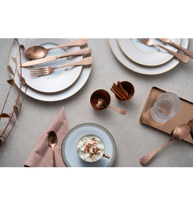 HERDMAR Комплект прибори за хранене “BETTY“ - за 6 човека от 24 части - с PVD покритие • Изработени от неръждаема стомана 18/10• PVD медно покритие. • Подходящи за почистване в съдомиялна машина.Комплектът включва: • Нож за хранене: 6 бр. • Вилица за хранене: 6 бр. • Лъжица за хранене: 6 бр. • Десертна лъжичка: 6 бр. ПРОИЗВОДИТЕЛ: HERDMAR / Португалия