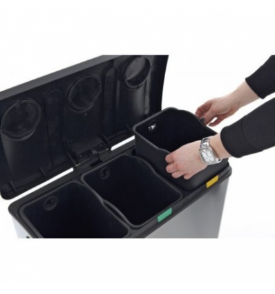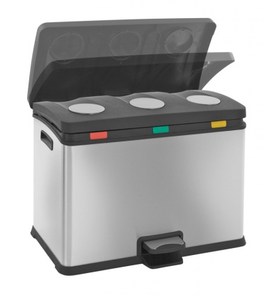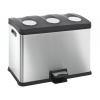 EKO EUROPE Кош за разделно събиране на отпадъци с педал “REJOICE““ • Материал: матирана неръждаема стомана, пластмаса • Цвят: хром / черен• Вместимост: 3 х 12 литра • Размери: 59,2 х 38,2 х 43 см.• 3 бр. вътрешни пластмасови кофи • Покритие срещу пръстови отпечатъци• Безшумно отваряне и затваряне на капака• Фиксатори за найлонов чувал / торбаПроизводител: EKO EUROPE / Холандия