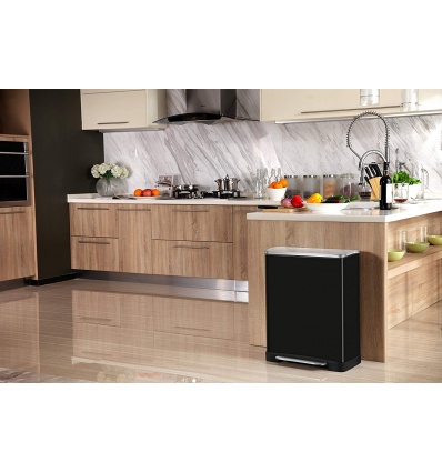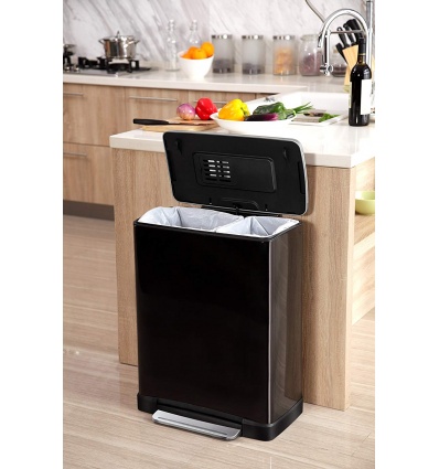 EKO EUROPE Кош за разделно събиране на отпадъци с педал “E-CUBE“ • Материал: неръждаема стомана, прахово боядисана• Вътрешно отделение на капака за филтър с активен въглен, който абсорбира миризмите• Цвят: черен• Широк педал • Дръжка на задната страна за лесно преместване• Вместимост: (1 х 28) + (1 x 18) литра • Размери: 50 х 34,5 х 65 см.• 2 бр. вътрешни пластмасови кофи• Безшумно и плавно отваряне и затваряне на капака• Функция за заключване на капака в отворена позиция, за лесно почистване или смяна на торбата• Фиксатори за найлонов чувал / торбаПроизводител: EKO EUROPE / Холандия