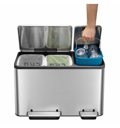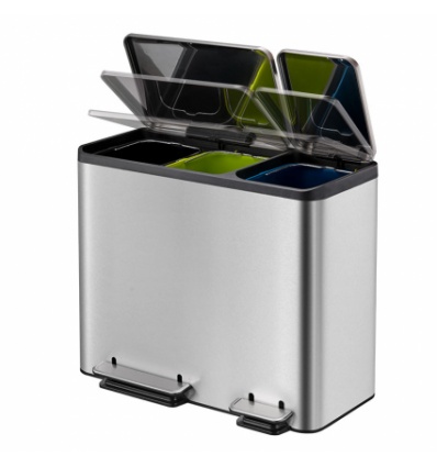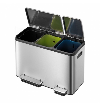 EKO EUROPE Кош за разделно събиране на отпадъци с 2 педала “ECOCASA“ • Материал: матирана неръждаема стомана, пластмаса• Цвят: хром / черен• Функция за заключване на капака в отворена позиция за лесно почистване или смяна на торбата• Вместимост: (2 x 15) + (1 x 15) литра • Размери: 32,1 х 49,2 х 60,5 см.• 3 бр. вътрешни пластмасови кофи • Покритие срещу пръстови отпечатъци• Безшумно отваряне и затваряне на капака• 2 бр. педали• Фиксатор за найлонов чувал / торбаПроизводител: EKO EUROPE / Холандия