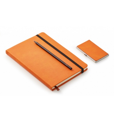 PHILIPPI Бизнес подарък “NOTES“ от 3 части • В комплекта: тефтер (A 5), молив и визитник • Материал: неръждаема стомана, еко кожа• Размер на кутията: 29 см (l) • Цвят: оранжев / черен • Производител: PHILIPPI / ГерманияDesign: Flip