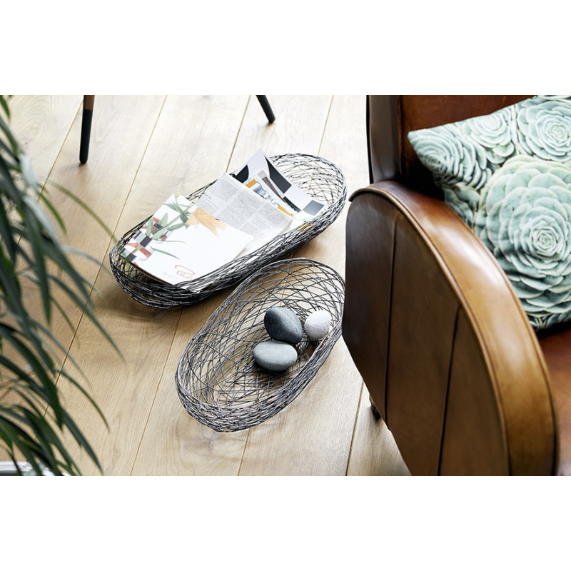 Тези уникални панери / фруктиери са навити на ръка и това ги прави уникални.  Всеки от двата (различни по размер) панера, могат да съхраняват аксесоари, шалове, малки одеяла, списания и вестници. Красиво стоят и пълни с плодове и зеленчуци. Изработени от черна никелирана неръждаема стомана, те наподобяват  птичи гнезда.