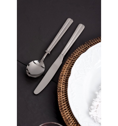 HERDMAR Комплект прибори за хранене "BROOKLYN" за 6 човека от 24 части. • Изработени от неръждаема стомана 18/10 • Подходящи за почистване в съдомиялна машина. Комплектът включва: • Нож за хранене: 6 бр. • Вилица за хранене: 6 бр. • Лъжица за хранене: 6 бр. • Десертна лъжичка: 6 бр. ПРОИЗВОДИТЕЛ: HERDMAR / Португалия