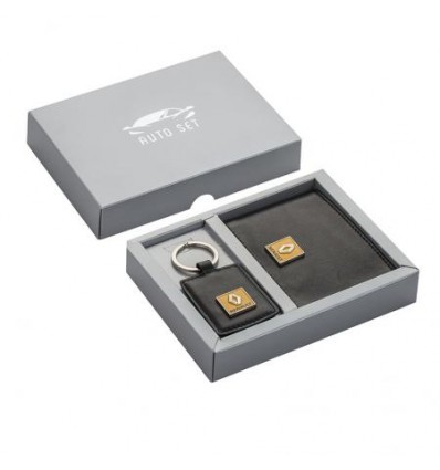 Автомобилен сет, включващ ключодържател и калъф от естествена кожа с лого. Размери: калъф за документи: 10*8 см, ключодържател: 9.5 см