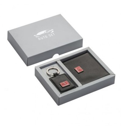 Автомобилен сет, включващ ключодържател и калъф от естествена кожа с лого. Размери: калъф за документи: 10*8 см, ключодържател: 9.5 см
