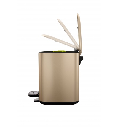 EKO EUROPE Кош за отпадъци с педал “REGENT“ • Материал: неръждаема стомана, прахово боядисана• Вградено отделение за поставяне на освежител или дезодорант за абсорбиране на миризми• Цвят: златно шампанско• Дръжка на задната страна за лесно преместване• Вместимост: 6 литра • Размери: 21 х 28,5 х 28,7 см.• Вътрешна пластмасова кофа• Покритие срещу пръстови отпечатъци• Безшумно и плавно отваряне и затваряне на капака• Функция за заключване на капака в отворена позиция, за лесно почистване или смяна на торбата• Фиксатор за найлонов чувал / торбаПроизводител: EKO EUROPE / Холандия