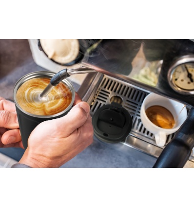 Това, което прави тази чаша уникална, е компактният размер, който лесно се побира под машините за кафе, както и в стандартен държач за чаши (за кола).