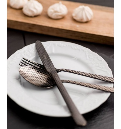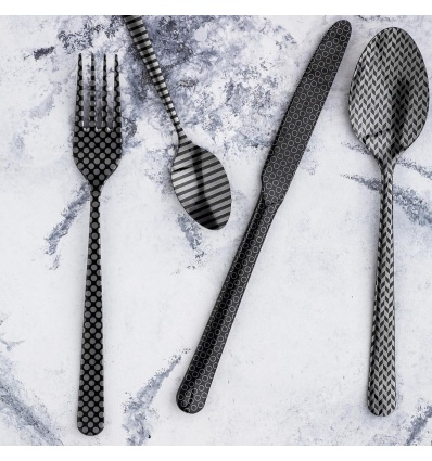 Комплект прибори за хранене Herdmar "OSLO №11" за 6 човека от 36 части. • Изработен от неръждаема стомана 18/10• Лазерно гравиран• Цвят: черен мат• PVD покритие Комплектът включва: • Нож за хранене: 6 бр. • Вилица за хранене: 6 бр. • Лъжица за хранене: 6 бр. • Десертна лъжичка: 6 бр. • Десертни ножа: 6 бр • Десертни вилици: 6 бр ПРОИЗВОДИТЕЛ: HERDMAR / Португалия