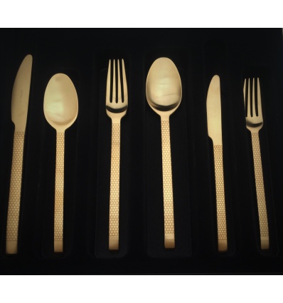 HERDMAR Комплект прибори за хранене “SPIGA №3" за 6 човека от 36 части. • Изработен от неръждаема стомана 18/10• Лазерно гравиран• Позлатени с 24 каратово злато (със сертификат ) Комплектът включва: • Нож за хранене: 6 бр. • Вилица за хранене: 6 бр. • Лъжица за хранене: 6 бр. • Десертна лъжичка: 6 бр. • Десертни ножа: 6 бр • Десертни вилици: 6 бр ПРОИЗВОДИТЕЛ: HERDMAR / Португалия