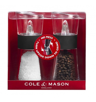 Както подсказва името, тези мелници се преобръщат на 180 °, така че мелещият механизъм да е отгоре. Изработени от прозрачен акрил с черен кант, те правят добавят стил към всеки дом. И двете мелници са керамичен механизъм на  Cole & Mason, което означава, че те са взаимнозаменяеми за пълнене със сол или пипер. Регулирайте едрината на смилане чрез затягане или разхлабване на механизма отгоре. За да почистите, избършете с влажна кърпа и използвайте чиста кърпа, за да подсушите. Препоръчваме Ви да не използвате почистващи препарати, тъй като това може да повлияе на покритието на продукта. Не потапяйте във вода и не поставяйте в съдомиялна машина.