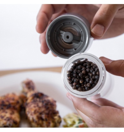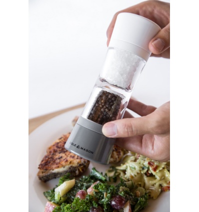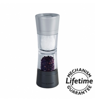 Мелницата Cole & Mason Lincoln Duo е съвременен представител на класическата мелница за сол и пипер 2-в-1. Нейният поразителен дизайн се състои от кристално чиста среда от акрил, в която се намират отделните контейнери за сол и пипер – бял за сол и сив за пипер. Керамичните механизми осигуряват равномерно смилане и могат да се регулират от едро до фино мелене.