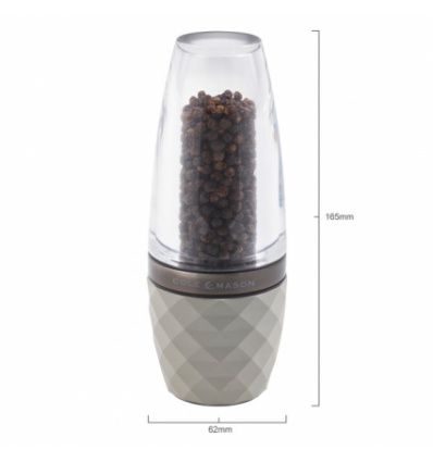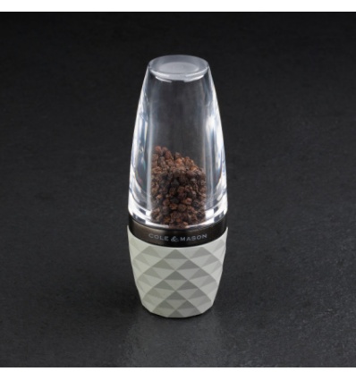 Стилна и съвременна мелница за пипер, вдъхновена от градската британска архитектура. Без усилие съчетава изчистената красота и семплия вид на камъка, като същевременно остават безценен всекидневен кухненски аксесоар. Опростената форма на прозрачния акрилен контейнер е проектирана да контрастира с геометрично оформения каменен фундамент. Структурата и мотива на камъка създават мелница, която Ви насърчава да я вземете и да я използвате при всяка възможност.