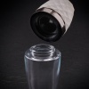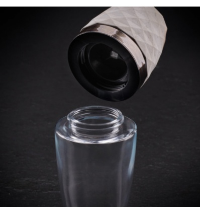 Изработена прозрачен акрил и технически камък, тази мелница е семпла, но заемаща централно място във всеки кът за хранене. Прозрачния контейнер контрастира добре с геометрично оформения технически камък, който се акцентира от пръстена от оксидирана стомана в средата. Камъкът е завършен със слой от прозрачен лак, за да се защити неговото покритие и да се предотвратят следите от ежедневна употреба. В основата е поставен пластмасов пръстен, който предпазва работните повърхности от контакти с камъка, за да се избегнат надраскване или повреда.