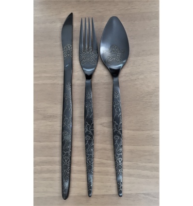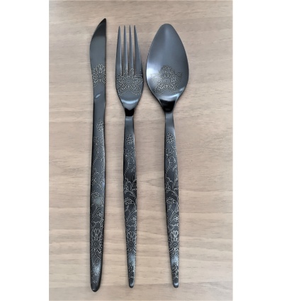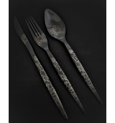 HERDMAR Комплект прибори за хранене "TIFFANY №1" за 6 човека от 36 части. • Изработен от неръждаема стомана 18/10• Лазерно гравирани• Цвят: черен мат• PVD покритие Комплектът включва: • Нож за хранене: 6 бр. • Вилица за хранене: 6 бр. • Лъжица за хранене: 6 бр. • Десертна лъжичка: 6 бр. • Десертни ножа: 6 бр • Десертни вилици: 6 бр ПРОИЗВОДИТЕЛ: HERDMAR / Португалия