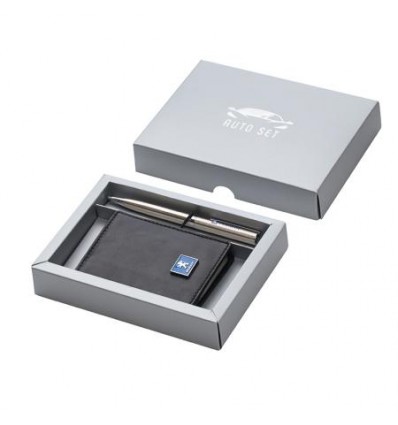Авто сет, включващ химикал и картодържател / калъф за документи от естествена кожа с лого. Размер на картодържател / калъф за документи: 8*10 см