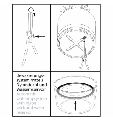 GEFU Самополиваща се кашпа за зелени подправки или цветя “BOTANICO“ • Система за самополиване с найлонов фитил• За стандартни саксии с размери: мин. Ø 11 см в основата и с макс. Ø 13 см отвор• Интегриран индикатор за нивото на водата• 500 мл резервоар за вода• Размери: Ø 14,2 х 18,5 см(В)• Можете да миете в съдомиялна машина• Материал: неръждаема стомана / найлон / PPПроизводител: GEFU / Германия