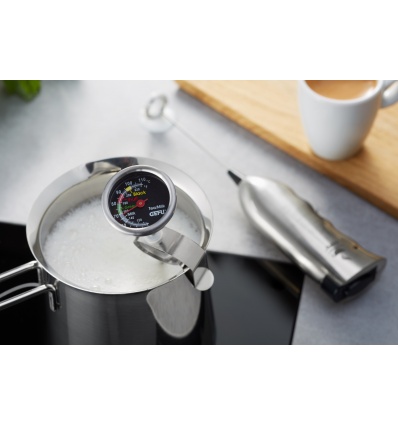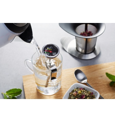 GEFU Термометър за чай и мляко “SIDO“ • Материал: висококачествена неръждаема стомана • Размери: Ø 3,4 х 14,1 см • Температурна скала: 40° до 110°С / 104° до 230° F• Цветово индикиране(за подходяща температура) за различните напитки• Можете да миете в съдомиялна машинаПроизводител: GEFU / Германия