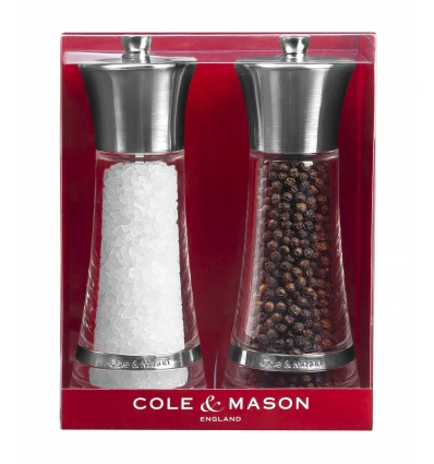 Височина: 17.5 см.• Материал: акрил, стомана, керамика• Цвят: хром• Механизъм на мелницата за сол: керамичен• Механизъм на мелницата за черен пипер: закалена въглеродна стомана• Да не се мокри с вода!• Не използвайте мелничките за различни от каменна сол и черен пипер продукти!!! Производител: Cole&Mason / Англия
